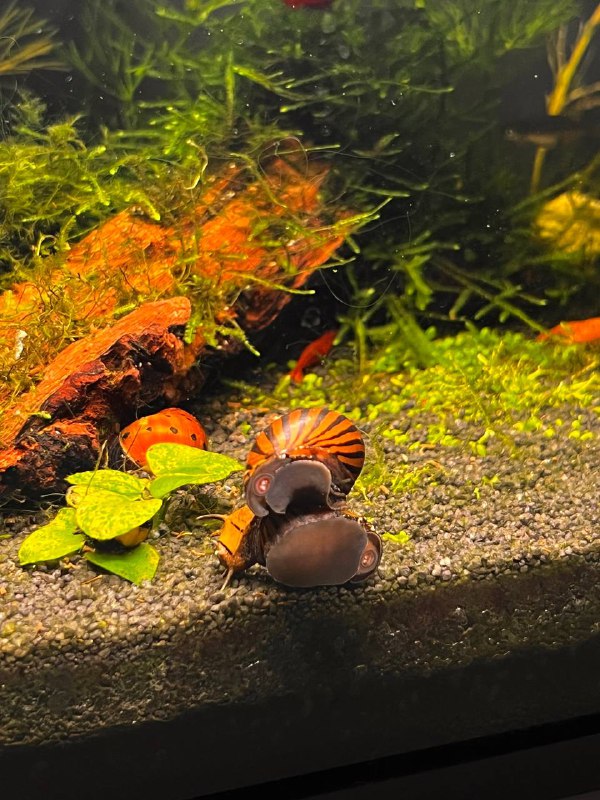 в голове есть рот, которым этот эпический улитон поджирает всякое, например зелёный налёт (водоросли) со стёкол и растений